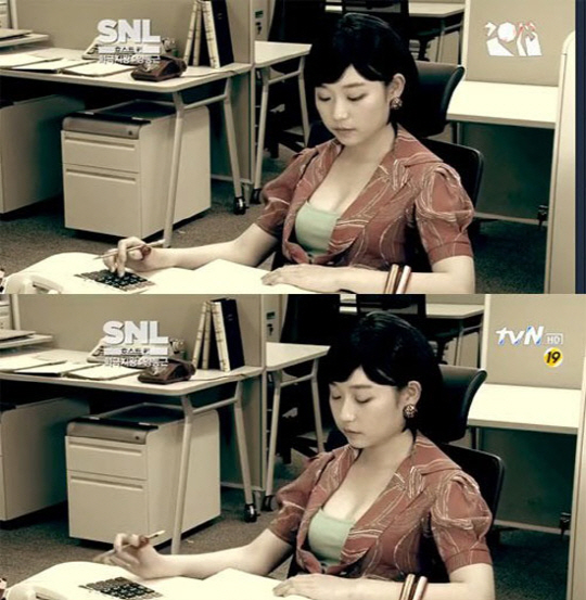 공개된 사진은 올해 초 방송된 tvN 'SNL 코리아'에 출연한 김슬기의 모습을 캡처한 것. 김슬기는 단정한 단발머리에 가슴라인이 드러나는 의상을 입고 귀여운 외모와는 상반되는 글래머러스한 몸매를 과시하며 시선을 모은다.