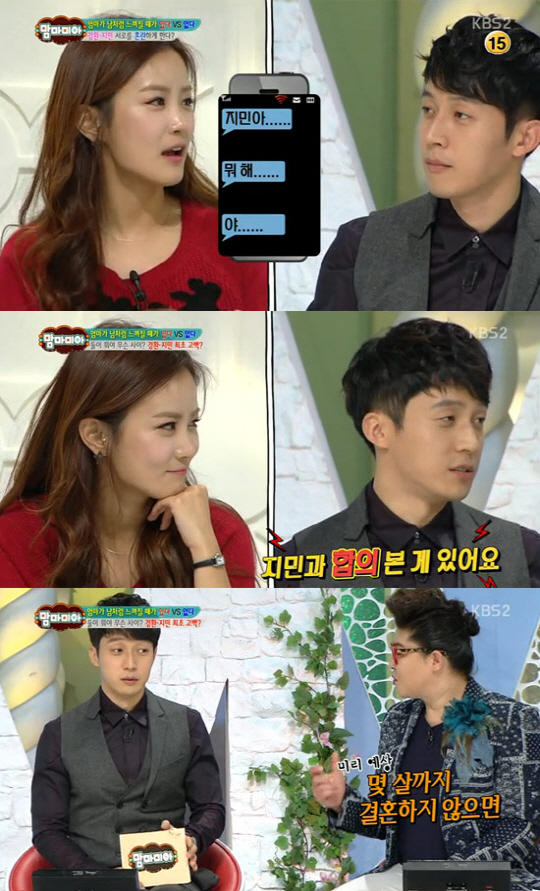 이후에도 MC박미선은 "경환씨 '맘마미아'에서 고백을 해 봅시다. 무슨 마음이냐"고 묻자, 허경환은 "지민씨하고 말이 잘 통한다. 내가 외롭고 지칠 때 지민씨한테 전화를 하거나 문자를 하면 잘 받아 준다"며 속마음을 털어놨다.