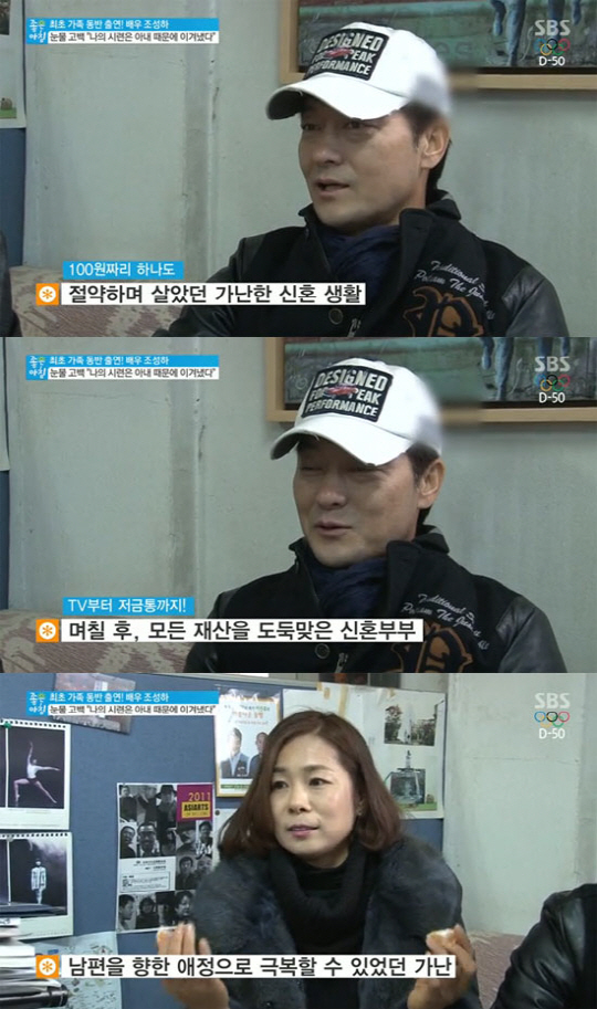 이에 조성하도 "무명시절 연봉 20만원을 받았다. 당시 택시운전, 배추장사, 일용직 벽돌지기까지 안 해 본 것 없다"며 아내에 대해 미안함을 내비쳤다.