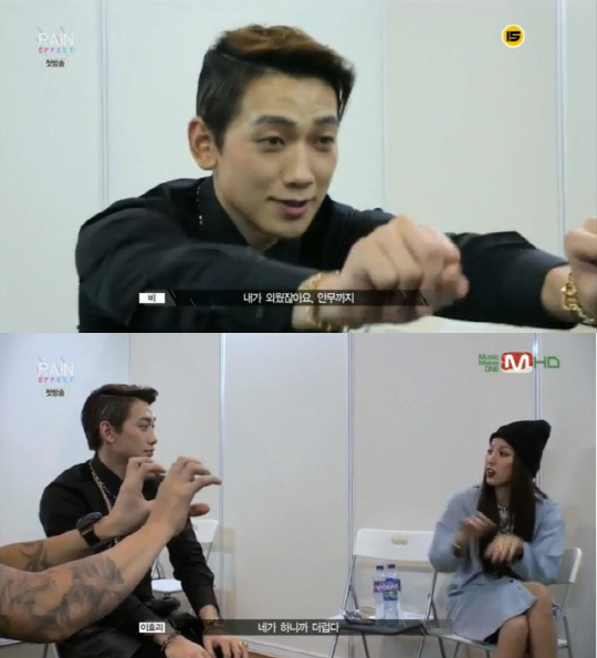 지난 19일 첫 방송된 Mnet '레인 이펙트(Rain Effect)'에서는 비가 '2013 엠넷 아시안 뮤직 어워즈(MAMA)' 공연을 앞두고 이효리 대기실을 찾는 모습이 그려졌다.