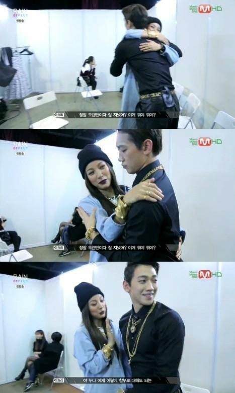 이날 비는 무대에 오르기 전 이효리의 대기실에 방문해 인사를 건넸고, 오랜만에 만난 이효리와 다정한 포옹을 나눴다.