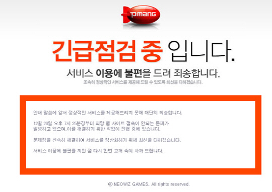 20일 피망은 공식 홈페이지를 통해 "긴급점검 중입니다"라는 글을 게재, 게임 유저들의 눈길을 끌고 있다.