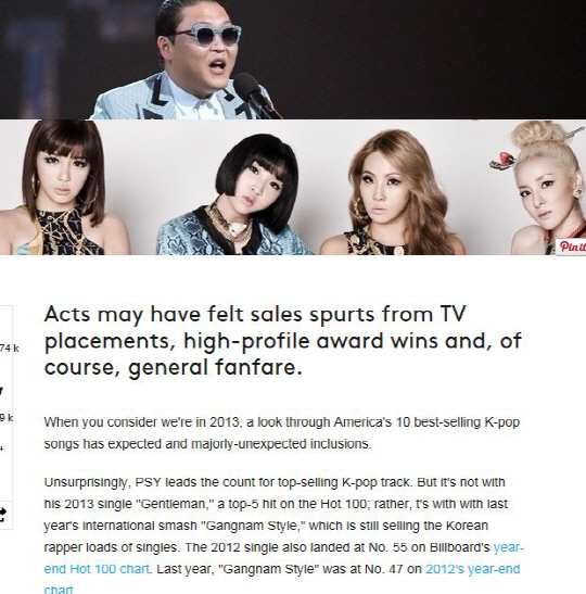 최근 미국 빌보드 온라인 뉴스는 '2013년 미국에서 가장 높은 판매량을 기록한 K팝 노래(2013's Biggest-Selling K-Pop Songs in America)' 순위를 발표했는데, 10위 안에 YG소속 가수들의 노래가 7곡이나 랭크되며 팝의 중심지인 미국에서도 K팝 최강자다운 면모를 과시하고 있다.