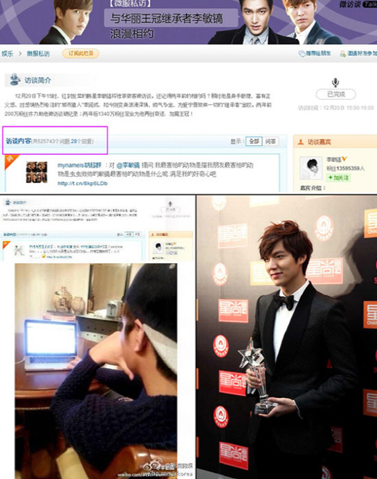 이민호 소속사 스타우스에 따르면, 지난 20일 이민호가 중국 SNS 웨이보를 통해 팬들을 대상으로 진행한 '웨이팡탄 인터뷰'에서 1시간만에 53만 건에 이르는 질문세례를 받으며 사상 최대의 신기록을 수립했다.