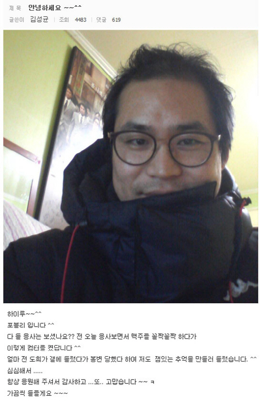21일 김성균은 디씨인사이드 '김성균 갤러리'에 '안녕하세요~'라는 제목으로 인증글을 남겼다.