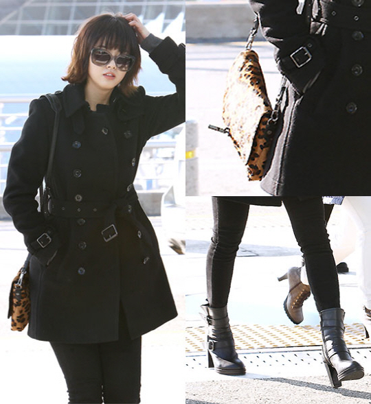 전체적으로 블랙 컬러로 시크한 매력을 선보인 고아라는 검정 트렌치 코트와 팬츠, 워커, 선글라스까지 블랙으로 통일했다. 여기에 애니멀 프린트로 된 미니백을 포인트로 매치한 그녀는 중성적인 매력을 자랑했다.