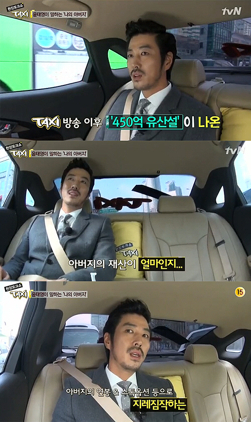 이날 윤태영은 "최근 '택시' 방송 이후 나에 대한 몇백억 유산설이 기사로 나오더라. 너무 많은 얘기로 인해 5년 늙었다"고 토로했다. 이는 이서진, 이종혁, 김민교가 과거 '택시'에 출연해 윤태영을 연예계 최강 로열패밀리로 꼽았기 때문.