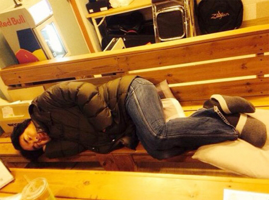 사진 속에서 그는 긴 의자에 패딩 점퍼에 양 손을 넣고 고단한 모습으로 자고 있다. 이는 그가 출연한 MBC '무한도전'의 '쓸친소(쓸쓸한 친구를 소개합니다)'를 연상케하며 누리꾼들의 눈길을 끌고 있다.