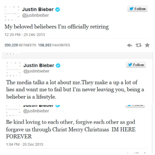 비버는 지난 17일에도 미국 로스앤젤레스 라디오 프로그램에 출연해 새 앨범 'Journals' 발표 후 은퇴하겠다고 선언한 바 있다. 당시 저스틴 비버의 소속사는 휴식을 취할지언정 은퇴 계획은 없다고 해명한 바 있다.