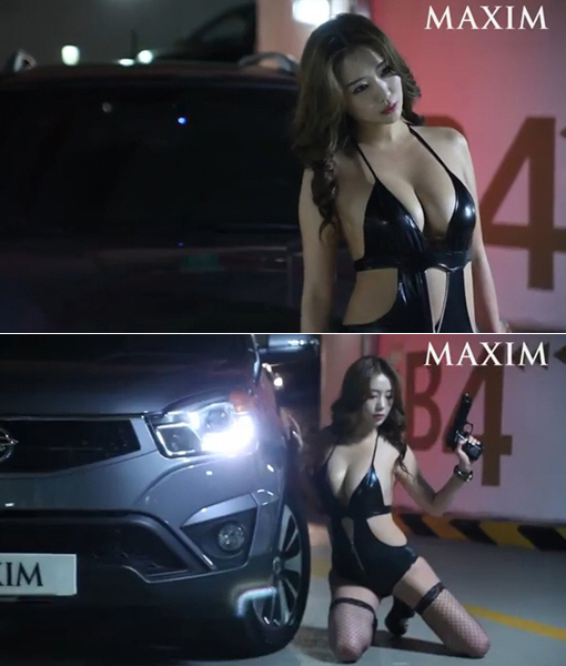 영상 속에는 엄상미가 신체의 주요 부위만 간신히 가려지는 섹시한 검은색 비닐 소재의 의상을 입고 망사스타킹을 신은 채 자동차 옆에서 다양한 포즈를 취하고 있다.