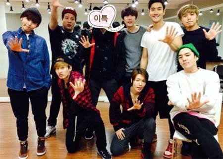 사진 속 슈퍼주니어 멤버들은 카메라를 향해 손바닥을 내민 특유의 포즈를 하고 있다. 특히 이특의 얼굴에는 '이특'이라는 글씨가 적힌 스티커가 붙여 있어 웃음을 자아냈다.