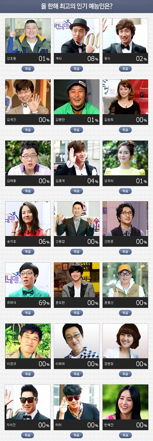 이번 '최고 인기 예능인'에는 강호동, 개리, 김병만, 송지효, 유재석, 이경규 등이 지난 1년 동안 SBS 예능을 빛낸 최고의 예능인들이 이름을 올렸으며, '최고의 인기 예능 프로그램'에는 '도전천곡', '런닝맨', '맨발의 친구들', '심장이 뛴다'등이 이름을 올렸다.