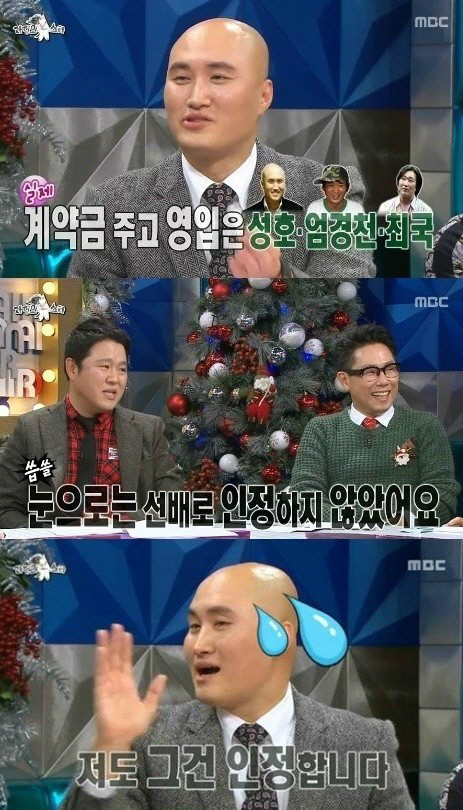 이날 MC 김구라는 "나, 황봉, 노숙자랑 계약하고 계약금을 안 줬다"며 "처음으로 계약금을 지불하고 소속사에 들어온 사람이 윤성호, 최국, 엄경천이었는데 말은 선배라고 했지만 우리를 선배로 보지 않았다"고 윤성호의 과거 행동을 꼬집었다.