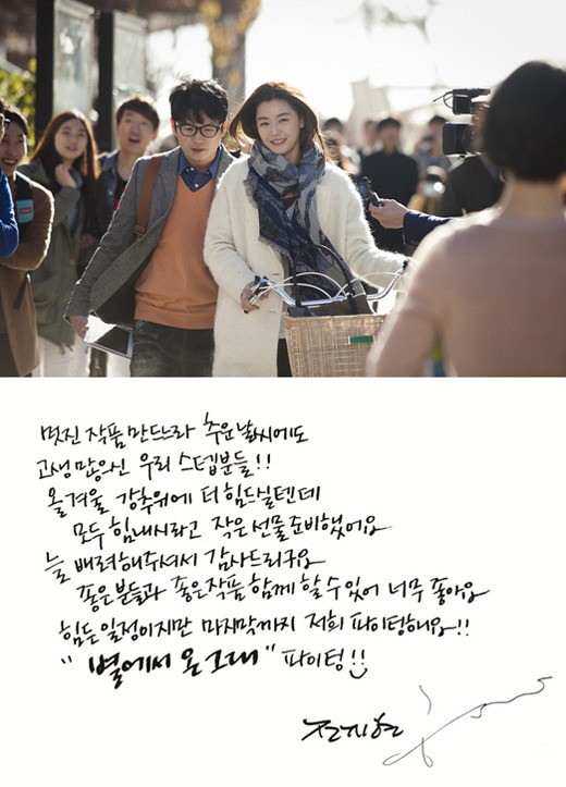 전지현은 "추운 날씨에도 불구하고 멋진 작품 만드느라 고생 많으신 스태프분들을 위해 힘내시라고 작은 선물을 준비했다. 늘 배려해주셔서 감사드리고, 좋은 분들과 좋은 작품 함께 할 수 있어서 너무 행복하다. 힘든 일정이지만 마지막까지 파이팅하자"라는 메시지를 전하며 스태프들의 사기를 북돋았다.