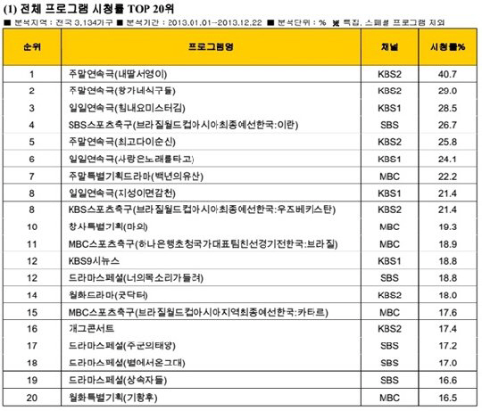 한편 이번 조사는 2013년 1월 1일부터 12월 22일까지 방송된 프로그램을 대상으로 진행됐으며 특집과 스페셜 프로그램은 제외됐다. <스포츠조선닷컴>
