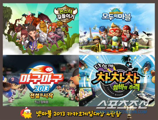 레이싱 액션 '다함께 차차차(개발사 턴온게임스)', 캐주얼 야구 '마구마구 2013(개발사 블루페퍼)', 캐주얼 보드 '모두의마블(개발사 엔투플레이)', 캐주얼 RPG '몬스터길들이기(개발사 씨드나인게임즈)' 등 4개 게임이 수상의 영광을 안은 것. '2013 카카오 게임대상'은 횔동유저, 신규가입자, 매출 등을 종합 집계해 월별로 이용자들에게 가장 많은 사랑을 받은 총 12개 게임을 본상 수상작으로 선정했는데, 넷마블 모바일게임이 가장 많았다.