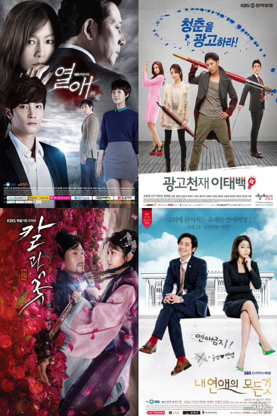 진부한 캐릭터와 전개 방식은 외면받을 수밖에 없다. '광고천재 이태백'은 실존 인물인 이제석 광고 디자이너를 모티브로 삼은 작품이라 기획 단계에서부터 관심을 받았다. 그러나 지방 삼류대 시각 디자인과를 중퇴하고 각종 아르바이트로 전전하며 살고 있지만 멋진 광고장이가 되겠다는 꿈을 가진 주인공 이태백(진구)을 시작으로 이태백의 옛 애인이자 성공을 위해 물불 가리지 않는 고아리(한채영), 재벌의 딸이란 사실을 숨기고 광고 회사에 인턴으로 입사한 백지윤(박하선) 등은 어디선가 많이 본 캐릭터다. 여기에 금산애드 강한철 대표의 외동아들 강민호 본부장(조현재)과 백지윤, 이태백의 삼각관계 등이 그려지며 지루한 전개가 이어졌다. 지금까지 존재하지 않았던, 광고라는 소재를 본격적으로 다룬 드라마라는 메리트가 있었음에도 '가난한 주인공이 고난과 역경을 극복하고 성공한다'는 '성공스토리'에만 초점을 맞춰 시청자의 호응을 이끌어내지 못했다. '로미오와 줄리엣'과 같이 비극적인 사랑을 표방한 '열애', '칼과 꽃' 모두 마찬가지로 어디서 많이 본 듯한 캐릭터와 설정이 신선도를 떨어트렸다.