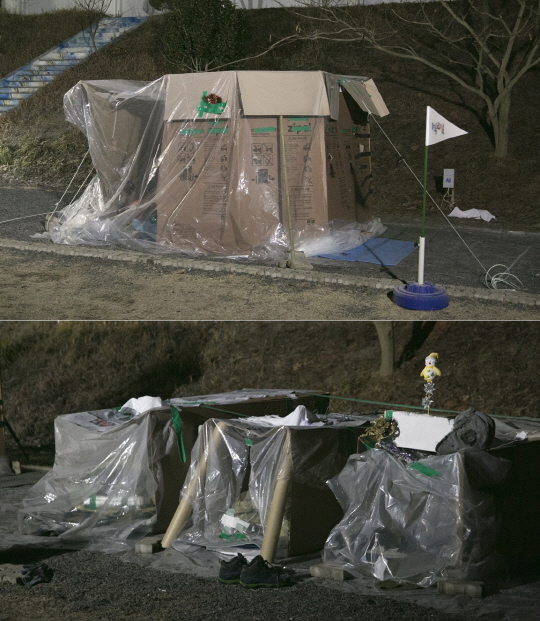 공개된 사진처럼 한 팀은 함께 체온을 나누기 위해 크게 한 채를, 나머지 팀은 각각 들어가서 잘 요량으로 원룸 형태로 세 채의 집을 만들었다. 종이기둥에 박스를 두르고,그 위를 비닐로 덮은 것이 영락없는 텐트의 외관을 띄고 있어 눈길을 끈다.