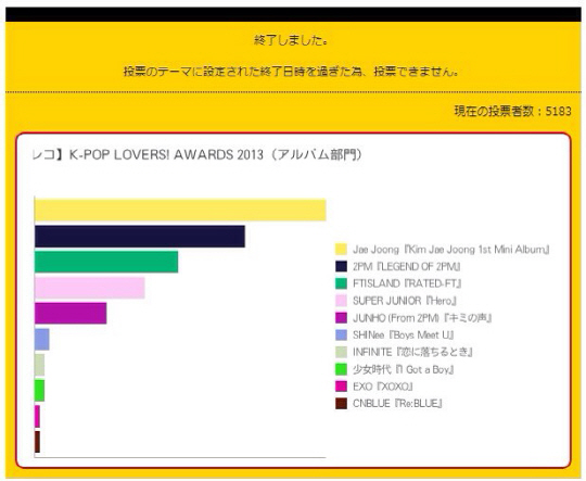 씨제스 엔터테인먼트는 "일본 타워레코드에서 진행한 'K-POP LOVERS! AWARDS 2013' 앨범부문에서 김재중의 첫 솔로 미니앨범 'I(2013.1월 발매)'가 1위를 차지 했다"고 밝혔다