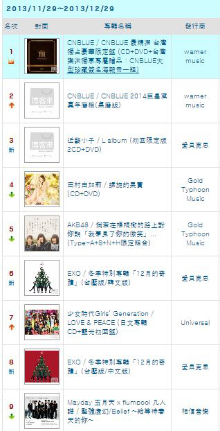 대만 최대 온라인 리테일 사이트 '북스닷컴(books.com.tw)'에 따르면 지난 13일부터 현지 선 주문을 시작한 씨엔블루 베스트 앨범 '프레젠트(PRESENT)'가 11월 29일에서 12월 29일까지 한 달간 집계한 월간 차트에서 1위를 차지했다. 1월 3일 대만 정식 발매를 시작하는 이 음반은 선 주문만으로 월간 차트 1위를 휩쓸며 씨엔블루의 대만 인기를 다시 한번 입증했다.