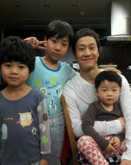 정우는 자신의 막내아들로 등장한 가장 어린 아역배우를 품에 안고 카메라를 향해 환한 미소를 짓고 있다.