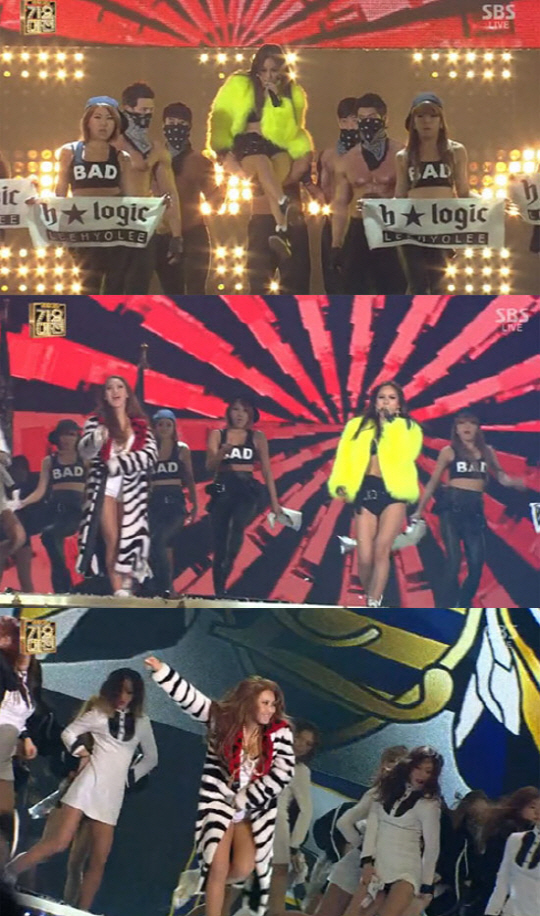 두 사람이 함께 한 합동무대에서 이효리는 핫팬츠에 블랙 톱 브래지어를 착용해 아찔한 매력을 선보였으며, 씨엘은 짧은 길이의 바디 슈트를 선택하며 섹시미를 발산했다.