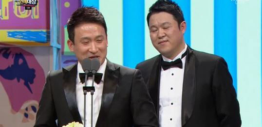 함께 무대에 오른 김구라 역시 "한 해 한 해 지나면서 상 몇 개 받고 하다가 나태해진 기억이 난다. 작년에 집에서 보다 이 자리에 앉아있는 게 정말 소중하다는 것을 알게 됐다"고 지난해 경솔한 발언으로 활동 중단을 해 연예대상에 참석할 수 없었던 아픔을 털어놨다. 이어 "'세바퀴'에 복귀한 데는 박명수씨의 공이 컸다"며 예능인답게 재치있는 멘트로 마무리했다.