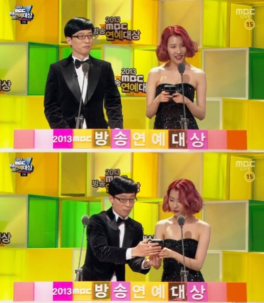 지난 29일 서울 여의도 MBC 공개홀에서 열린 'MBC 연예대상'에서 유재석과 선미는 버라이어티 부문 신인상 시상자로 무대에 올랐다.