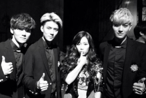 해당 사진은 지난 29일 열린 '2013 SBS 가요대전' 현장에서 찍은 것으로, 태연과 루한, 세훈, 타오가 나란히 서서 카메라를 향해 미소를 짓고 있는 모습이 담겨있다.