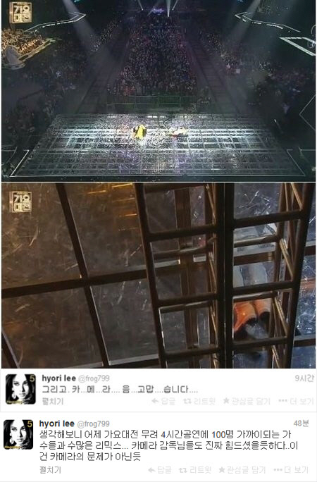 그러나 다음날인 30일 이효리는 자신의 트위터에 올린 불만 글을 삭제한 뒤 "생각해보니 어제 가요대전 무려 4시간공연에 100명 가까이 되는 가수들과 수많은 리믹스… 카메라 감독님들도 진짜 힘들었을 것. 이건 카메라의 문제가 아닌 듯"이라며 해명 글을 남겼다.