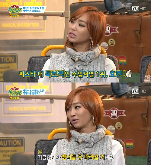 효린은 지난 12월 31일 방송된 Mnet '비틀즈코드 3D'에서 "씨스타 내 수입서열 1위는 옛날 일이다"라고 말했다.