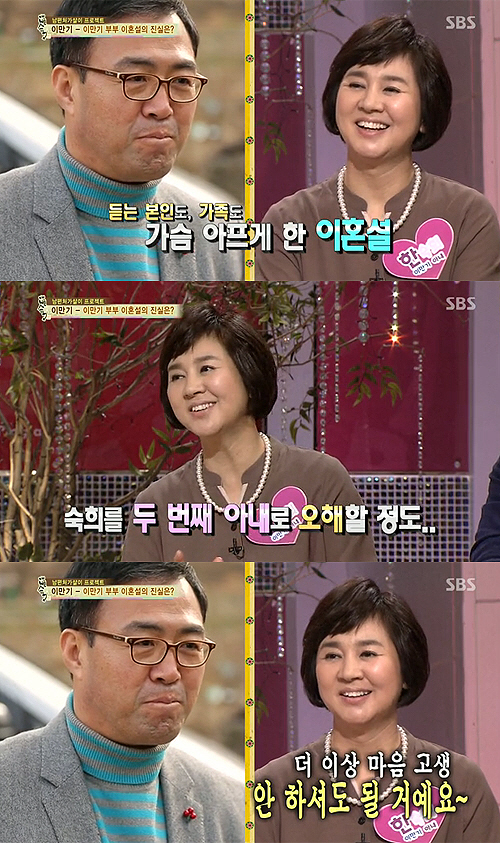 이날 스튜디오에 출연한 이만기의 아내 한숙희 씨도 "이혼설을 주위에서 많이 들었다. 애들 때문에 8년간 외국 생활을 했다. 방학 때 한국에 오가긴 했는데 그때 이혼했다는 말을 들었다"고 털어놨다. 이어 "남편이 어디 모임에 가서 아내와 밥을 먹었다고 하면 '그 아내는 애가 몇이냐' '본처도 애가 둘이라더니'라는 말을 듣거나 심지어 재혼해서 애가 둘이라는 얘기도 했다더라. 그럴 때는 너무 속상하다"며 그동안의 마음고생을 토로했다.
