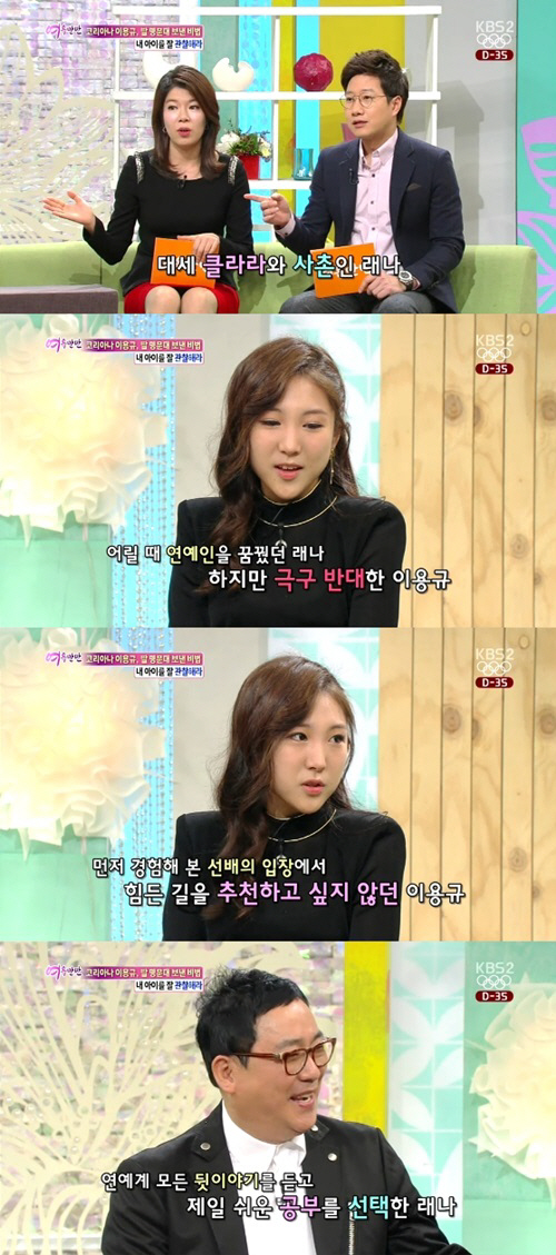 3일 오전 방송된 KBS2 '여유만만'에서는 그룹 코리아나 멤버 이용규가 아내 주세량과 딸 이래나와 함께 출연해 딸을 명문대에 보낸 비법을 공개했다.