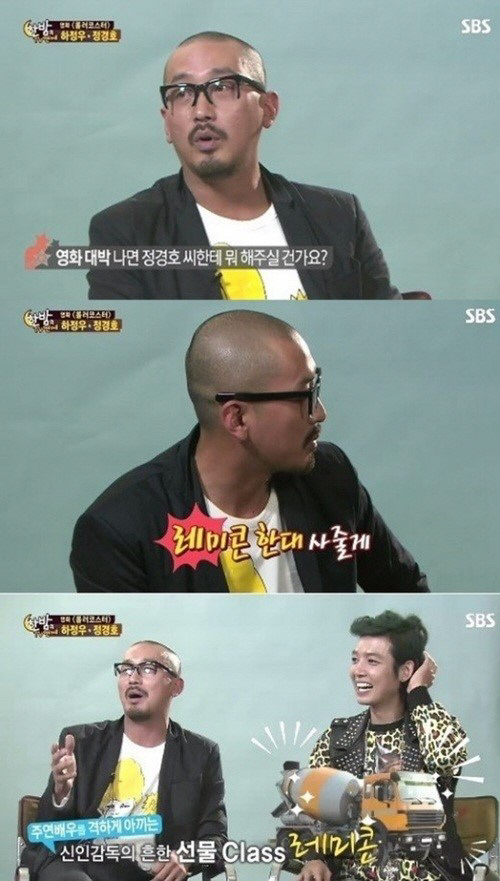 배우 겸 감독 하정우는 지난해 9월 수영이 진행을 맡고 있는 SBS '한밤의 TV 연예'에서 정경호에게 "영화가 대박 나면 레미콘을 사 주겠다"고 말했다. 당시 하정우는 영화 '롤로코스터'의 감독으로 주연배우 정경호와 함께 출연했다.
