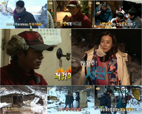 말 그대로 '산 넘고 물 건너' 솟탱이골에 도착한 사남일녀. 동생 이하늬가 4박 5일용 짐을 잔뜩 챙겨왔고, 섬세한(?) 오빠 서장훈은 서로의 짐을 바꾸며 자신이 이하늬의 거대한 짐을 도맡는 멋진 모습을 보여줬다. 이에 김구라는 "우애가 너무 좋네. 요즘 예능 같지 않게 너무 훈훈하다"고 말해 웃음을 자아냈는데, 칼바람과 가득 쌓인 눈에 휘청대는 서장훈의 모습이 겹쳐져 큰 웃음을 선사했다.