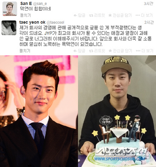 앞서 옥택연은 같은 날 오전 트위터에 JYP엔터테인먼트를 향한 따끔한 일침글을 올렸다. 그는 "돕지도 않고 관리도 하지 않은 사람이 승진했다고 하면 내 옆에서 돕고 관리해준 분들은 뭐가 되는 것이며, 이해 가능한 선택을 한 것인가? 회사에 연예인으로서 있는 나도 이해 못 하는 회사를 팬들은 이해해줄 것인가? 2014년 JYP는 지금 개혁이 필요하다"고 쓴소리를 했다.