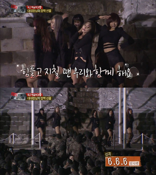 또 달샤벳은 이날 신곡 'B.B.B' 이외에도 '촛불 하나', '내 다리를 봐(Be ambitious)' 등 신나는 무대와 퍼포먼스는 물론 '군통령'답게 장병 한명 한명의 손을 따뜻하게 잡으며 아침부터 고된 내한적응 훈련으로 추위와 싸우느라 지치고 힘든 장병들을 위로했다.