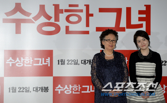 6일 서울 성동구 CGV왕십리에서 영화 '수상한 그녀' 시사회가 열렸다. '수상한 그녀'는 스무살 꽃처녀(심은경)의 몸으로 돌아간 욕쟁이 칠순 할매(나문희)가 난생 처음 누리게 된 빛나는 전성기를 그린 휴먼 코미디 영화다. 영화 '수상한 그녀'는 오는 22일 개봉한다. 시사회에 참석한 배우 나문희, 심은경이 포토타임에서 포즈를 취하고 있다. 왕십리=송정헌 기자 songs@sportschosun.com/2014.01.06