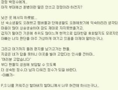 '장정 박정수에게'라는 제목으로 시작하는 이 편지글에서 이특 아버지는 "아직 부대에선 훈병이라는 말은 안쓰고 장정이라 하겠지?"라고 말문을 연 뒤 "낯선곳에서의 하룻밤, 갑자기 떨어진 기온에 추위도 많이 느껴 현역으로 입대한 걸 후회할지도 모르지만 아빠는 너의 판단을 아주 가상하게 여기고 있음을 이제야 말한다"며 현역 결정을 내린 아들을 기특해했다.