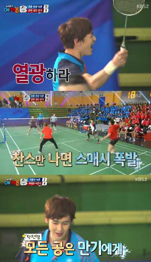 또, 닉쿤은 배드민턴 코치 이동수와 복식조를 이뤄 하태권-이만기와 대결에서 이동수의 도움을 받아가며 거침없는 공격으로 상대팀을 압박하며 환상적인 플레이로 '셔틀콕 황태자'의 면모를 유감없이 보여줘 눈길을 끌었다.