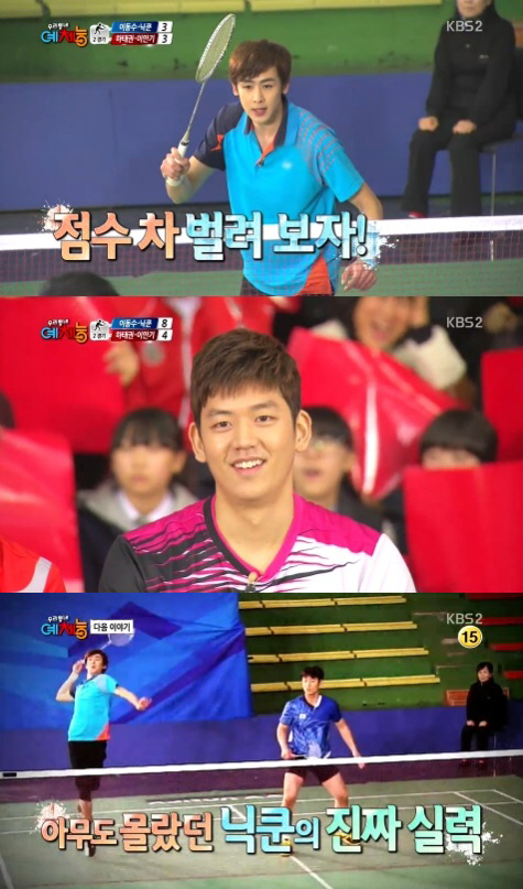 그룹 2PM 닉쿤이 뛰어난 배드민턴 실력을 선보이며 국가대표 이용대도 놀라게 했다.