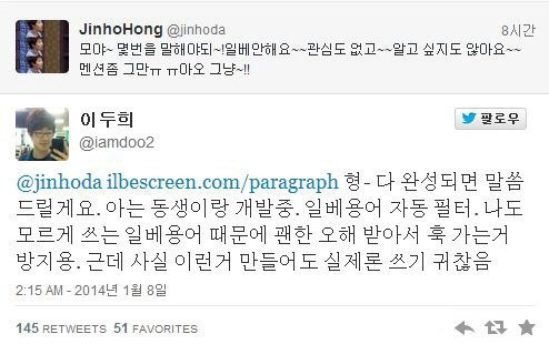 이에 이두희는 트위터에 "형. 다 완성되면 말씀드릴게요. 아는 동생이랑 개발 중. 일베 용어 자동 필터. 나도 모르게 쓰는 일베 용어 때문에 괜한 오해 받아서 훅 가는 거 방지용. 근데 사실 이런 거 만들어도 실제로 쓰기 귀찮음"이라는 멘션을 보냈다.