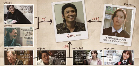 캐릭터 포스터 3종과 더불어 '태일의 인물 관계도'가 추가로 공개됐다. 공개된 주변인으로는 아버지(남일우)와 태일의 형수 미영(김혜은), 그리고 조카 송지(강민아)가 있다. 여기에 '신세계'와 '감시자들'에서 인상적인 연기를 선보인 김병옥이 맡은 돈 밝히는 타락 목사 캐릭터가 소개되며 더 풍성한 영화로서의 기대감을 심어 준다.