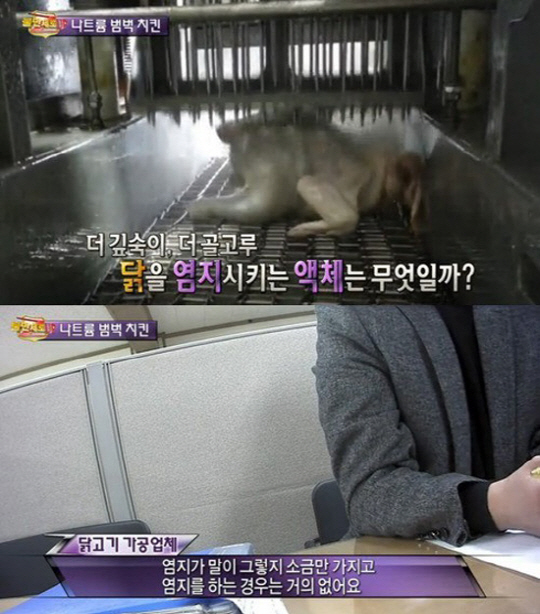 하지만, 방송에서는 생닭에 바늘을 넣어 염지제를 투입하거나 한꺼번에 세탁기에 닭을 넣고 돌려 버무리는 등의 충격적인 과정이 공개, 염지제가 고무장갑을 녹일 정도로 독하다는 사실 역시 공개되며 시청자들을 경악케 했다.
