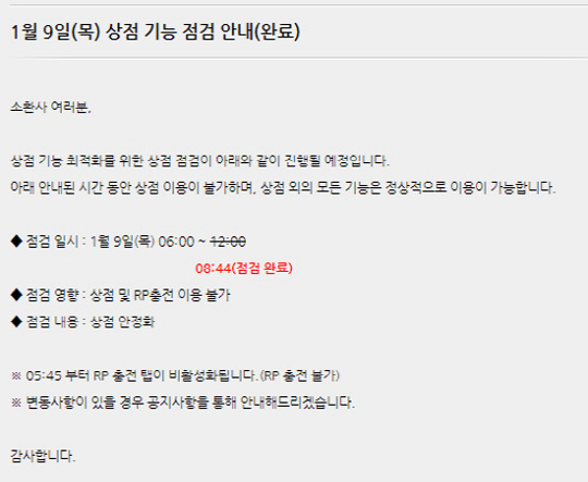 9일 라이엇게임즈 측은 "이날 오전 6시부터 12시까지 상점 기능 최적화 및 안정화를 위한 점검이 진행된다"고 밝혔다. 해당 점검은 공지된 시간보다 빠른 8시44분에 완료됐다.