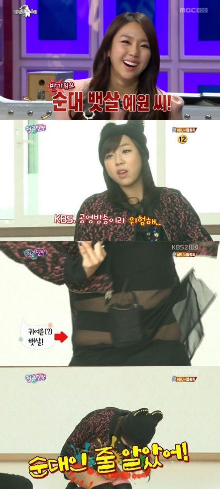 이때 시스루 의상 속 예원의 뱃살이 적나라하게 비쳤고, 이를 본 멤버들은 "뱃살 봐, 순대인 줄 알았어"라고 놀려 예원을 당황하게 했다.