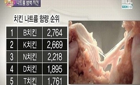 이날 불만제로 제작진이 밝힌 브랜드별 치킨 나트륨 함량순위는 1위 B치킨 2,764, 2위 K치킨 2,669, 3위 N치킨 2,218, 4위 D치킨 1,895, 5위 T치킨 1,761(단위 mg/600g) 등의 순으로 이어졌다. 대부분 치킨들이 세계보건기구(WHO)의 나트륨 일일섭취권장량(2,000mg)을 넘는 수치를 기록하고 있어 불안감을 증폭시켰다.