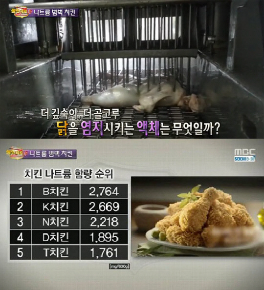 제작진에 따르면 치킨 브랜드별 나트륨 함량순위는 1위가 B치킨 2,764, 2위 K치킨 2,669, 3위 N치킨 2,218, 4위 D치킨 1,895, 5위 T치킨 1,761(단위 mg/600g)을 기록, 높은 수치를 드러냈다.