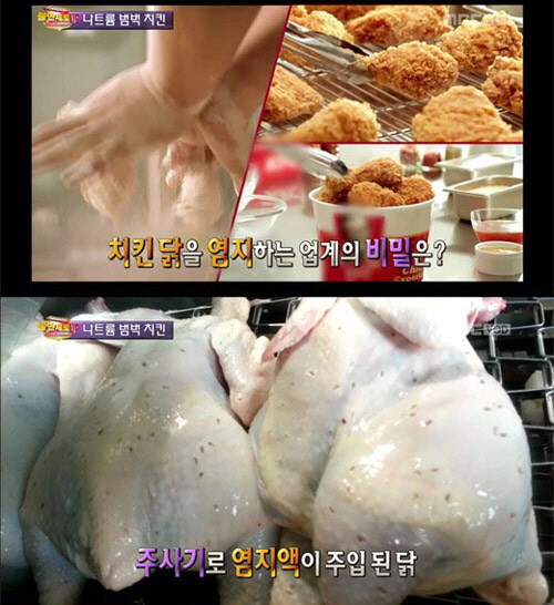 이날 제작진은 닭고기 가공업체의 한 관계자에게 치킨 속에 염지제가 포함된다는 사실을 전해 들었다. 염지제에는 소금과 많은 조미료가 들어 있어 나트륨 수치가 굉장히 높으며, 고무장갑을 녹여버릴 정도로 독성이 있다.