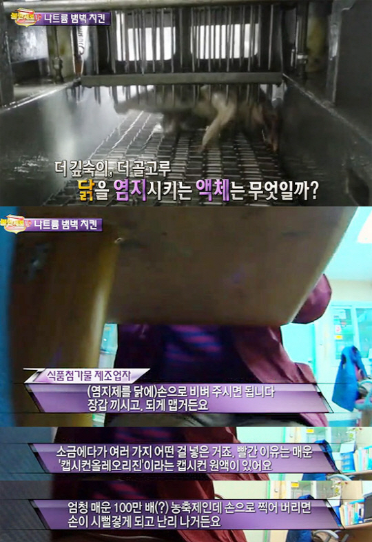 또 닭고기 가공업체 측은 "염지제에는 조미료가 많이 들어있어서 우린 치킨 안 시켜 먹는다"고 말하며 시청자들을 분노케 했다.